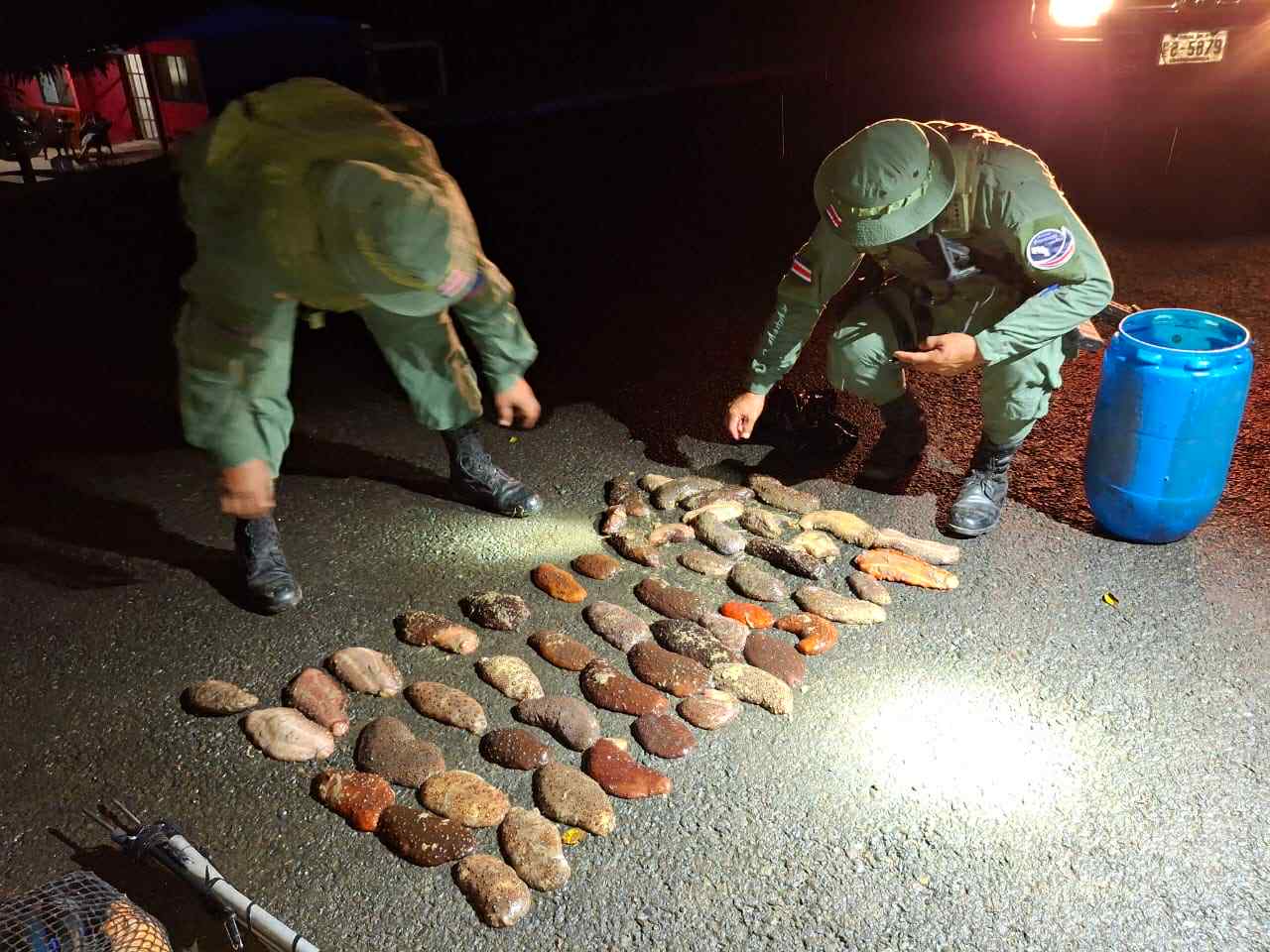 El cumplimiento tuvo lugar en playa Junquillal, cuando los oficiales fronterizos abordaron a tres sujetos, uno de apellido Morales y dos hermanos apellidados Brenes, quienes llevaban un recipiente con 53 animales marinos conocidos como pepinos de mar, una arbaleta y equipo de buceo como un esnórquel y unas patas de rana.